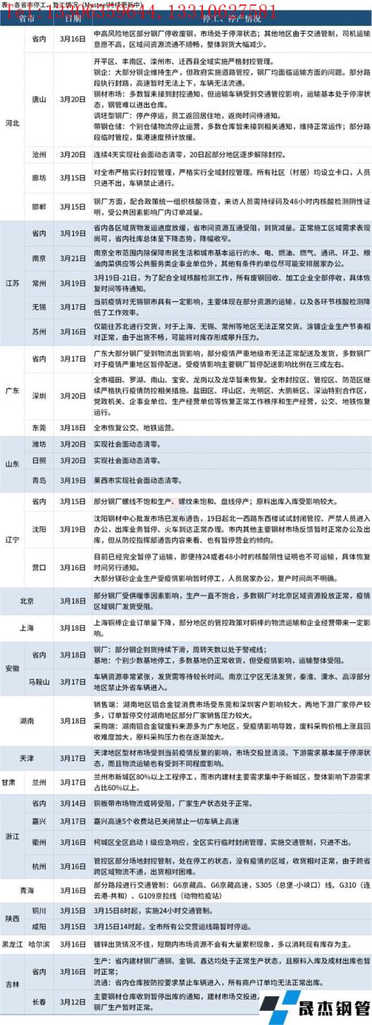 好像是一夜之間,疫情再次卷土重來(lái)。截至3月21日,16個(gè)省份停工復(fù)工情況見(jiàn)下表。其中,3月21日,南京全市范圍內(nèi)除保障市民生活和城市基本運(yùn)行的水、電、燃油、燃?xì)?、通信、環(huán)衛(wèi)、糧油肉菜供應(yīng)等公共服務(wù)類(lèi)企事業(yè)單位外,其他有條件的單位盡可能安排居家辦公。3月20日,唐山開(kāi)平區(qū)、豐南區(qū)、灤州市、遷西縣全域?qū)嵤﹪?yán)格封控管理;大部分鋼企維持生產(chǎn),但政府實(shí)施道路管控,精密管廠(chǎng)家均面臨運(yùn)輸方面的問(wèn)題。深圳全市福田、羅湖、南山、寶安、龍崗以及龍華暫未恢復(fù),全市封控區(qū)、管控區(qū)、防范區(qū)繼續(xù)嚴(yán)格執(zhí)行疫情防控相關(guān)措施。山東濰坊、日照、青島萊西市實(shí)現(xiàn)社會(huì)面動(dòng)態(tài)清零。河北滄州連續(xù)4天實(shí)現(xiàn)社會(huì)面動(dòng)態(tài)清零,3月20日起部分地區(qū)逐步解除封控。
